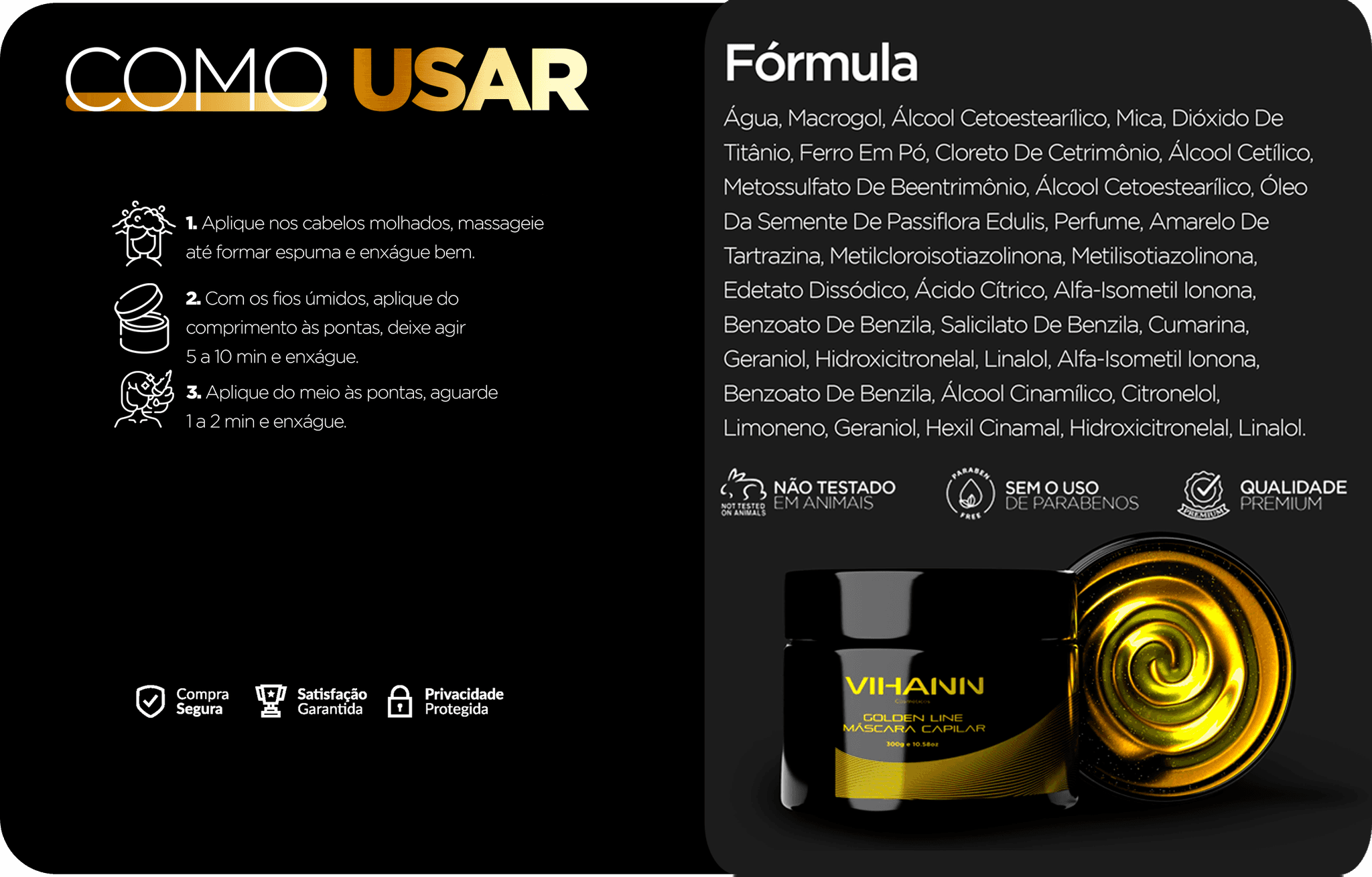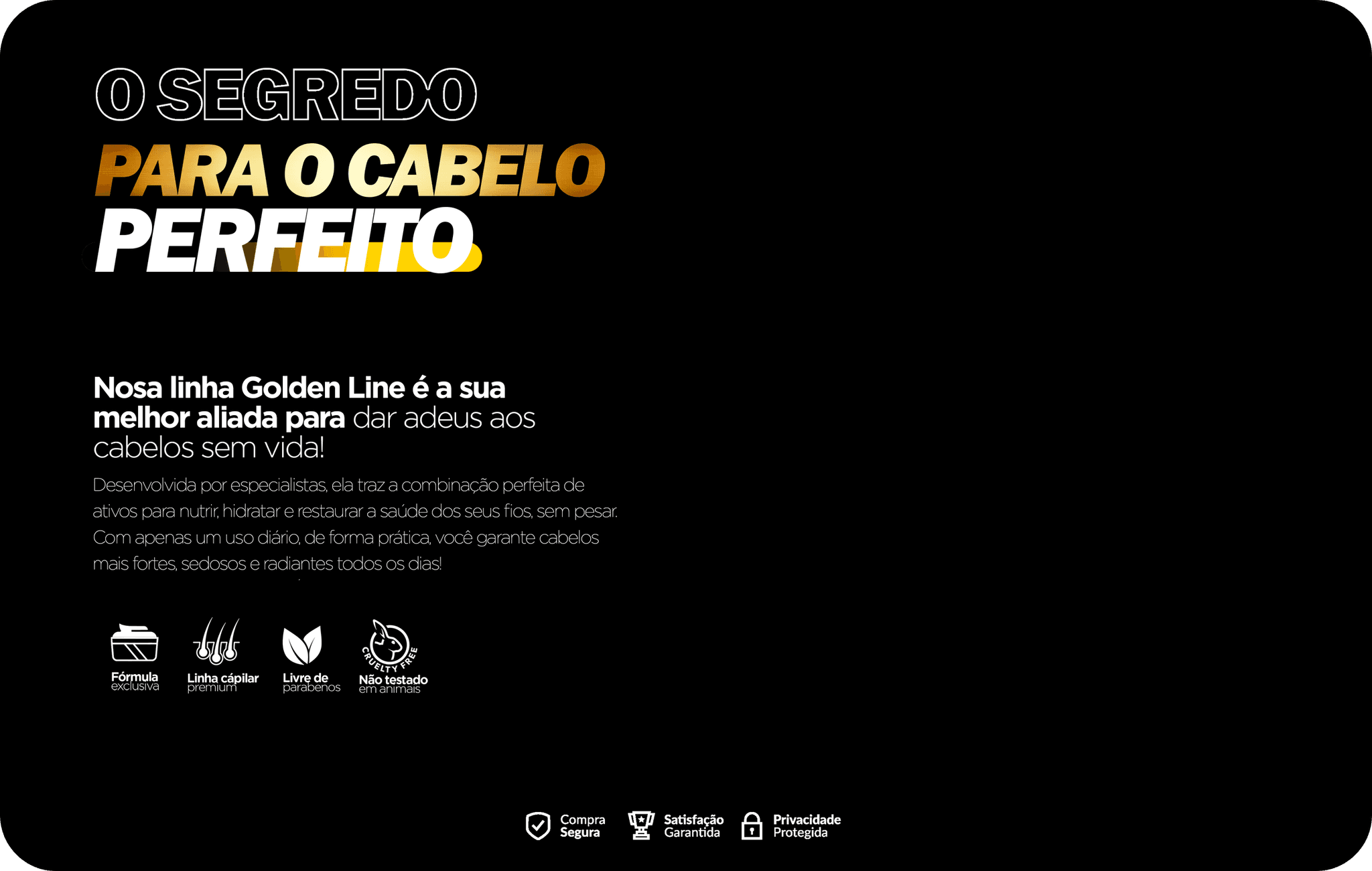 Com uma fórmula exclusiva de textura dourada, nosso Shampoo, Condicionador e Máscara Hidratante restauram, hidratam e protegem, revelando a riqueza que existe nos seus cabelos!