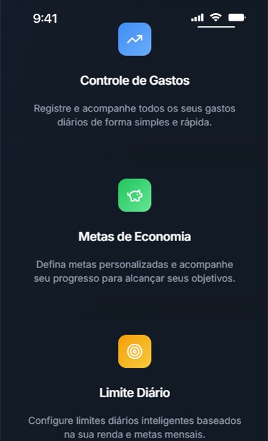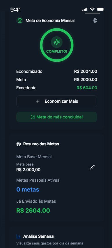 Defina seus objetivos — como viagens, reservas ou compras importantes — e veja em tempo real quanto já economizou e quanto falta para conquistar suas metas.