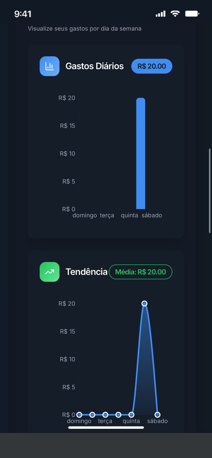 Acompanhe seus gastos por dia da semana com gráficos claros. Descubra seus padrões de consumo e tome decisões mais conscientes sobre onde economizar.
