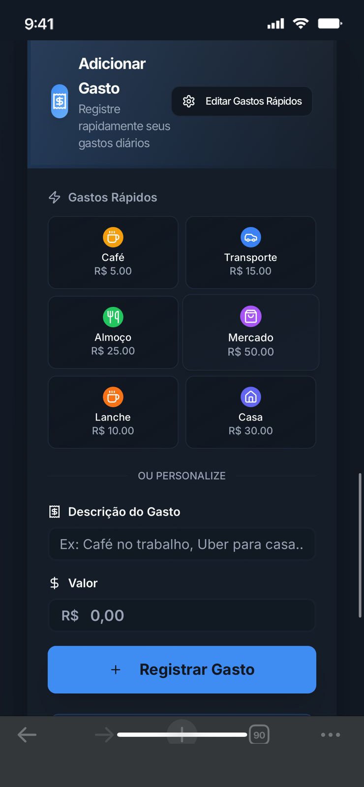 Registre seus gastos com um clique usando categorias como transporte, comida, lazer e mais. Um sistema prático para quem quer agilidade sem abrir mão do controle.