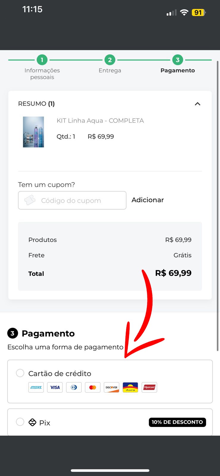 gora você deve escolher a forma de pagamento. Estão disponíveis duas opções principais: cartão de crédito, com as principais bandeiras aceitas como Visa, Mastercard, Elo, Amex, Hipercard e outras; e Pix, que garante um desconto automático de 10% sobre o valor da compra. Após selecionar a forma de pagamento desejada, finalize o processo conforme as instruções da plataforma.