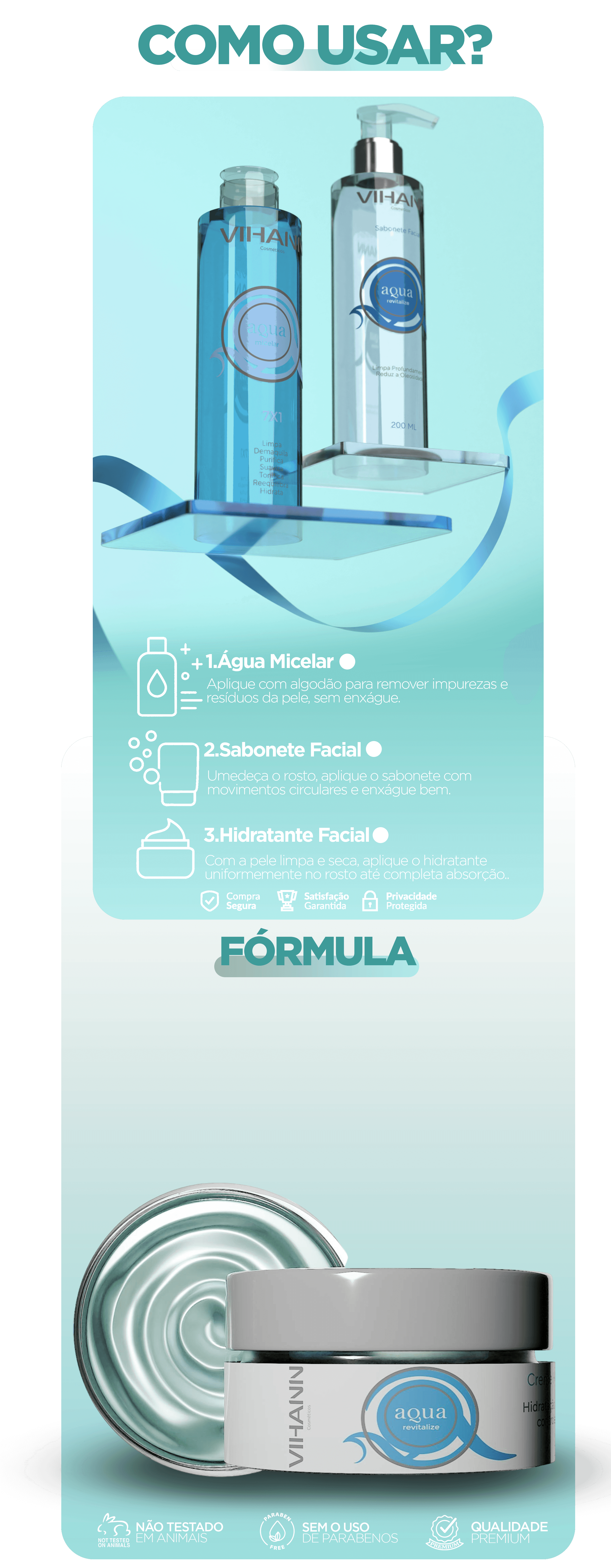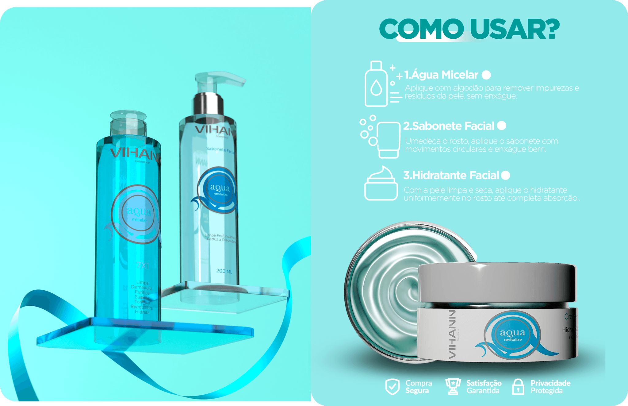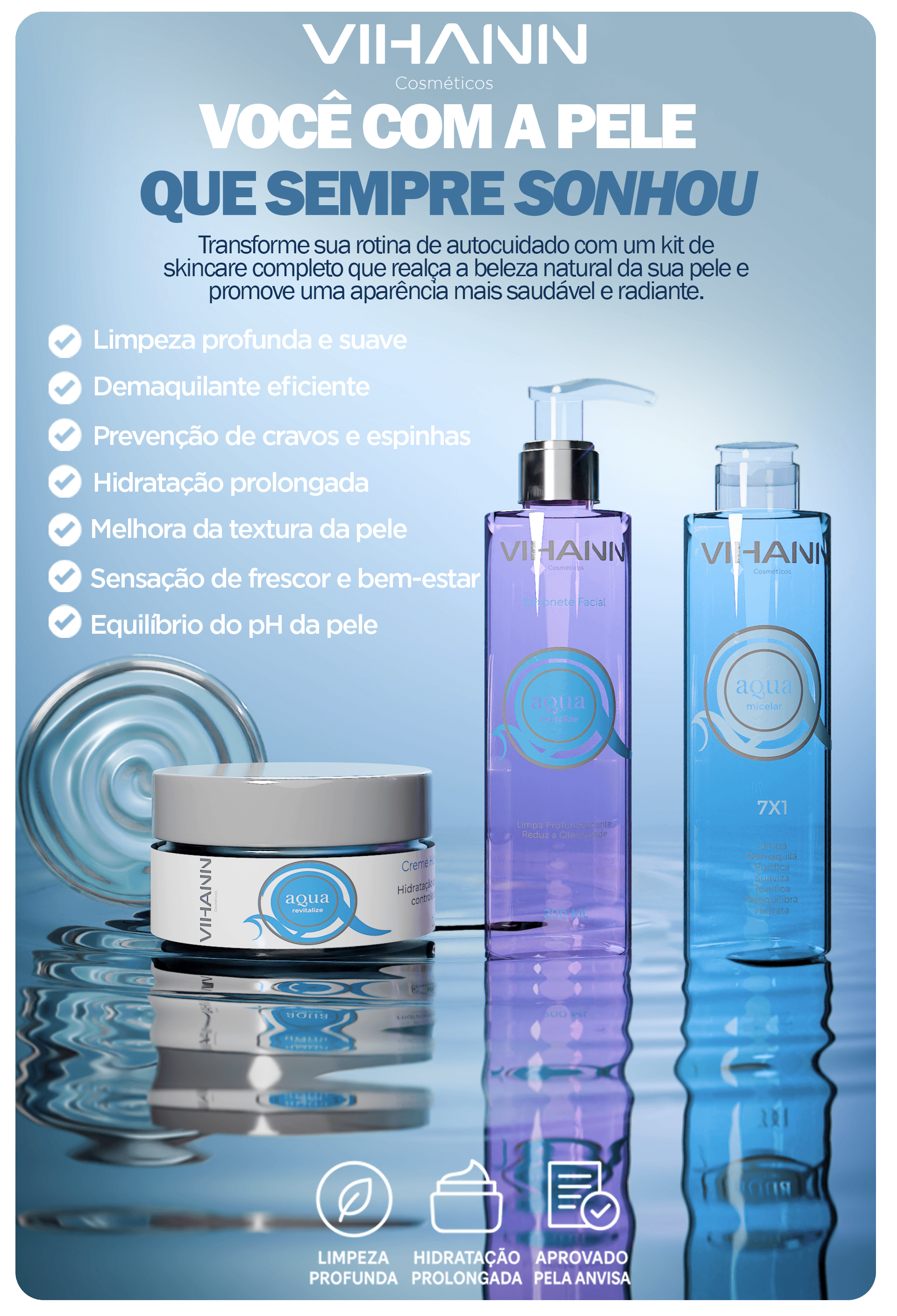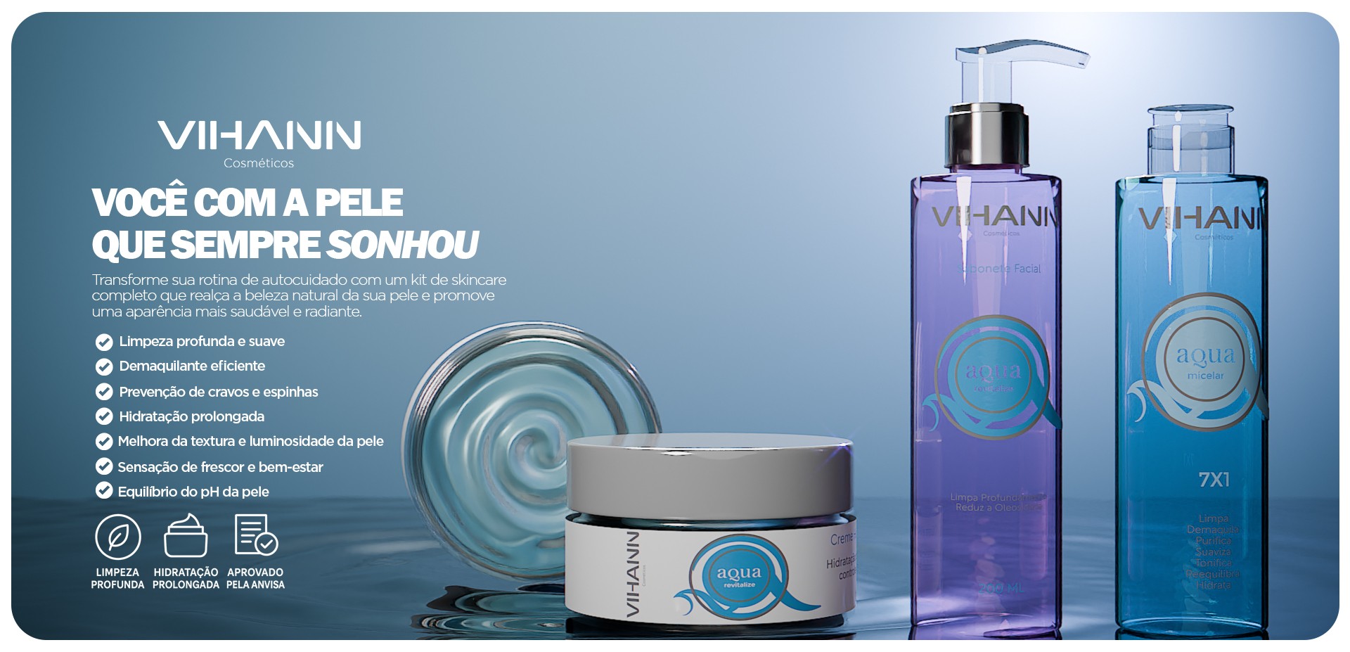 A Linha Água purifica, controla a oleosidade, hidrata profundamente e prepara a pele para o cuidado ideal tudo de forma simples, eficaz e completa.