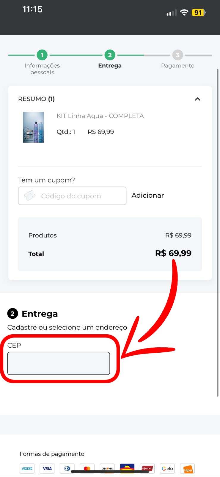 Nesta etapa, você verá um resumo do seu pedido com a descrição do produto adquirido, a quantidade e o valor total da compra. No exemplo, o produto selecionado é o KIT Linha Aqua - COMPLETA no valor de R$ 69,99. Caso tenha um cupom de desconto, você pode inseri-lo no campo específico. Em seguida, vá até a seção de endereço e preencha o campo de CEP corretamente. O sistema buscará automaticamente o endereço completo com base no número informado. Confirme se os dados estão corretos e continue.