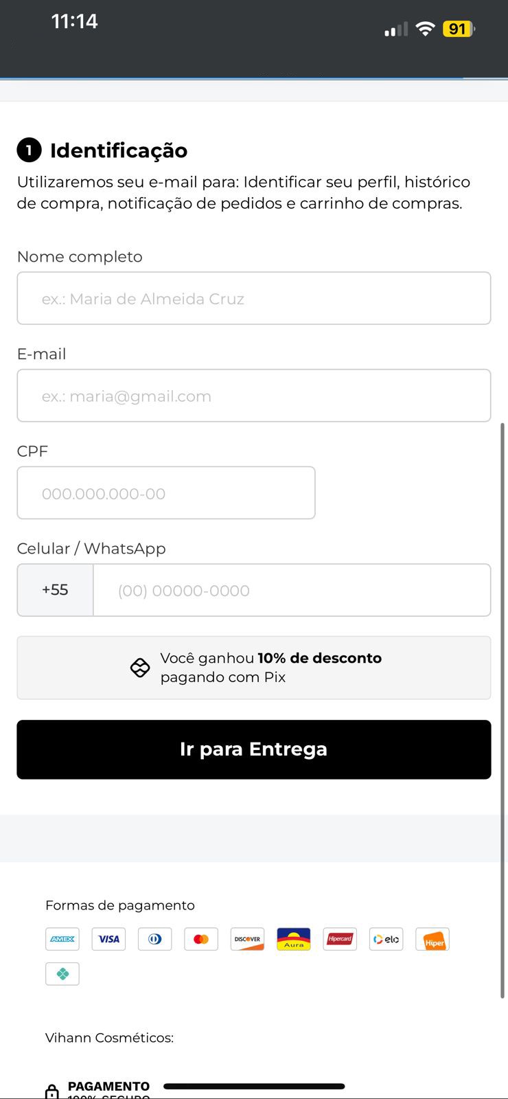 Na primeira etapa do checkout, você deve preencher corretamente seus dados pessoais. Informe seu nome completo no campo indicado, digite um e-mail válido que será utilizado para notificações e acompanhamento do pedido, preencha seu CPF e o número do seu celular com WhatsApp para facilitar a comunicação. Logo abaixo, será exibida uma informação de que você ganhou 10% de desconto caso escolha pagar com Pix. Após preencher todos os campos obrigatórios, clique no botão “Ir para Entrega” para seguir para a próxima etapa.